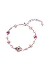 This bracelet combines the warm texture of 925 sterling silver and rose gold, and is set with carefully selected red, green, and white cubic zirconia. Zirconia is highly regarded for its excellent refractive index and hardness, which can present a sparkling effect comparable to natural gemstones. The soft color tone of rose gold creates an elegant contrast with colorful gemstones, enhancing the overall design's delicacy. 925 silver ensures structural stability and durability, making it suitable for long-term daily wear. Each cubic gemstone is precisely cut to capture light to the fullest extent possible. This is a masterpiece of jewelry that combines modern design with advanced craftsmanship.